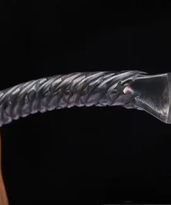 Equipped with a Damascus steel blade, which is a crucible mixture of 1060 high carbon steel, manganese spring steel, 1045 soft steel and many more smaller portions of other steels. This mixture is then folded multiple times to remove impurities, creating many hundreds of individual steel layers, finally producing arguably the best sword-making steel available.