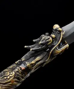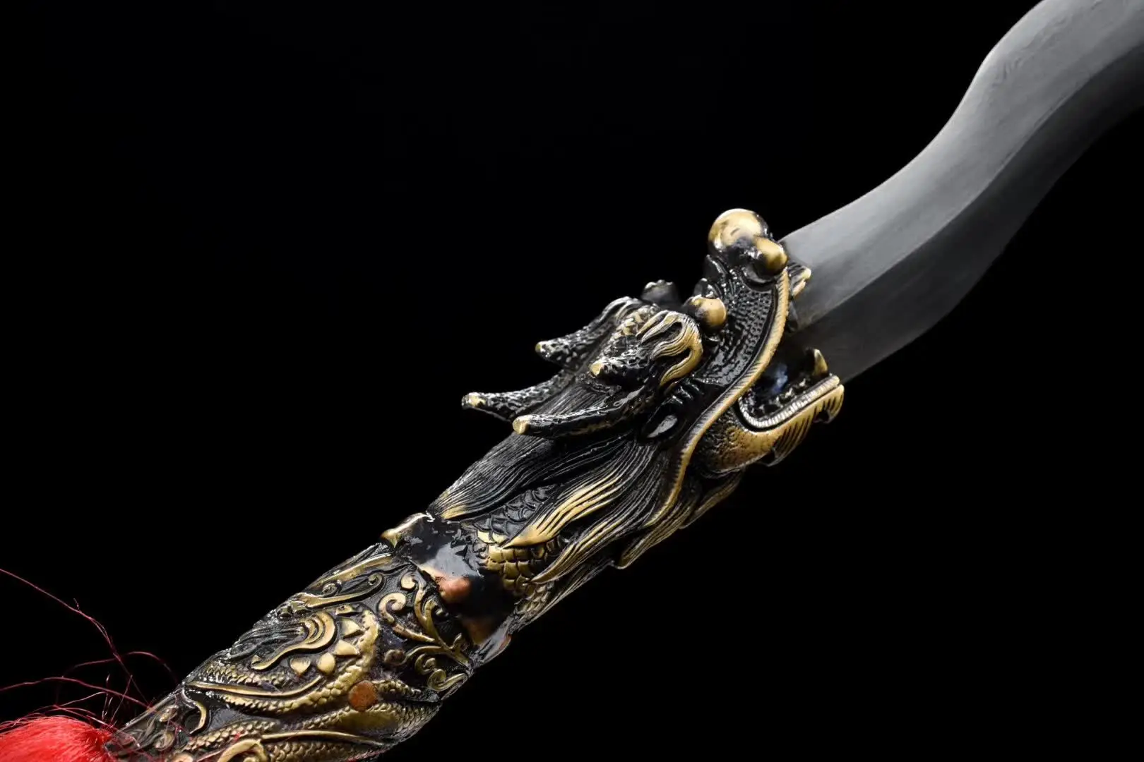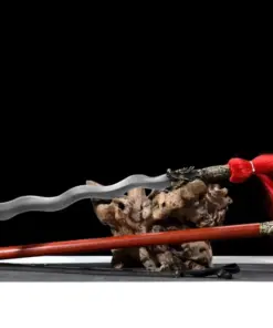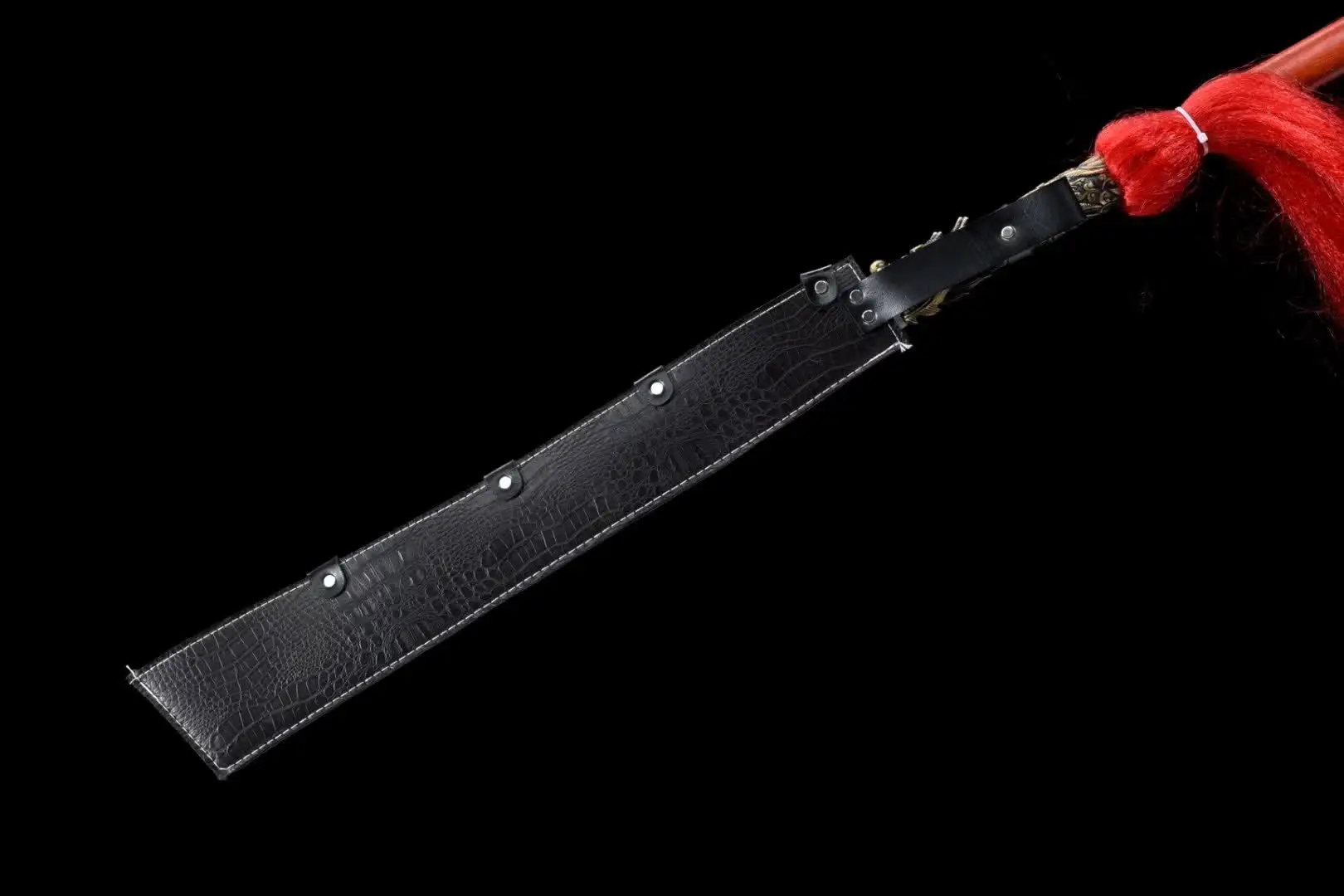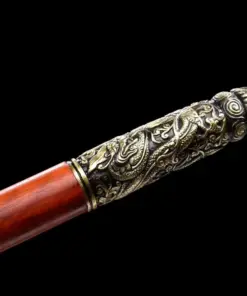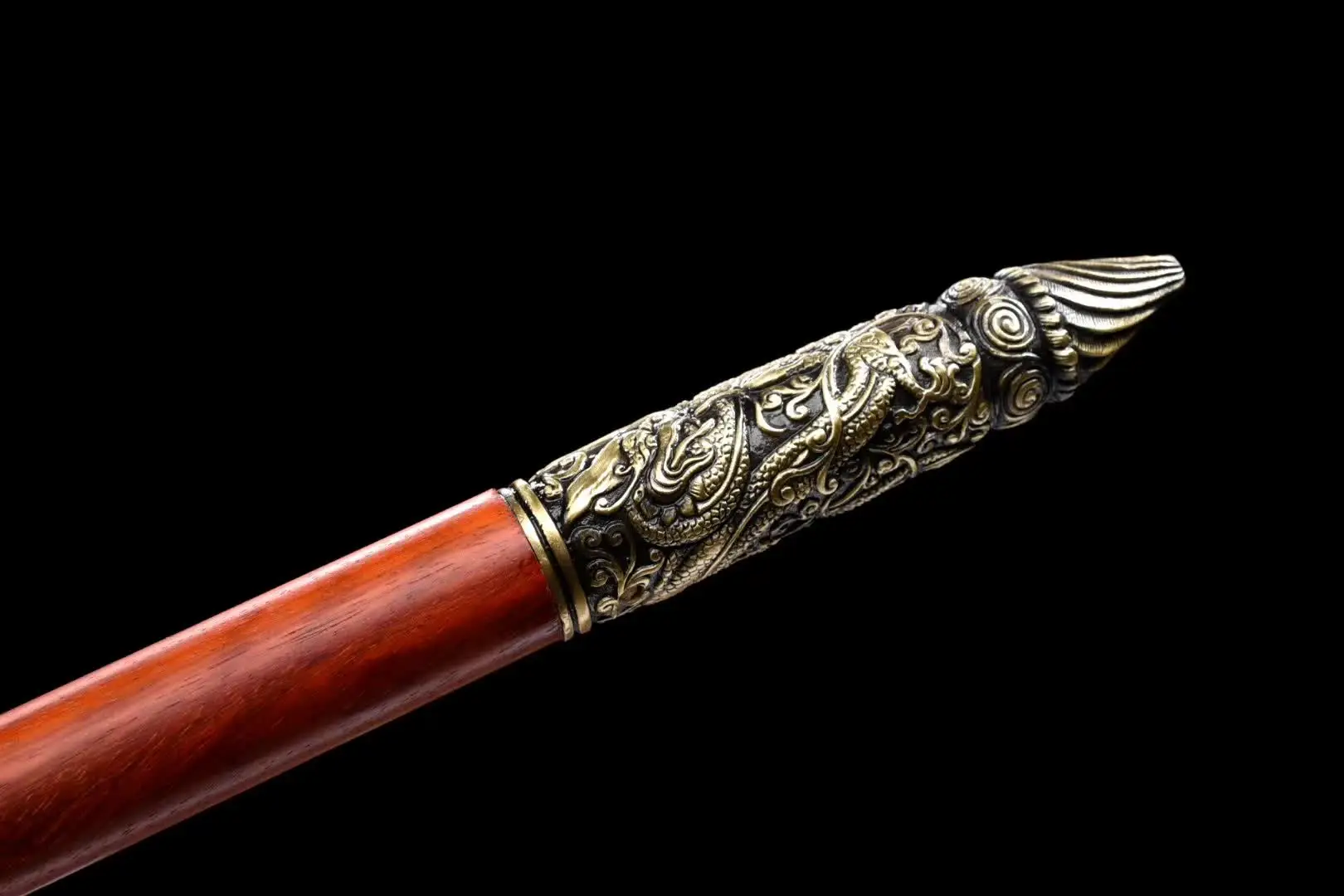 Completed with beautiful hand-crafted brass fittings – devoted to the powerful Chinese dragon, and premium two-piece red hardwood handle, forming a strong and forgiving spear-handle, which can be used in either short spear or long spear configurations.