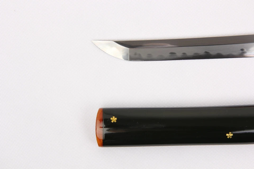 - Saya (scabbard) material: Gloss lacquered hardwood, with 3x buffalo horn inserts & inlaid with brass flowers.