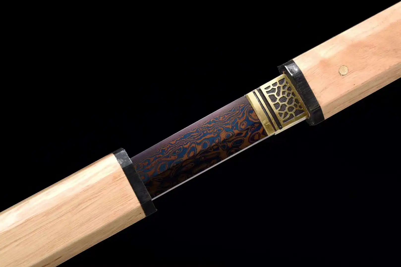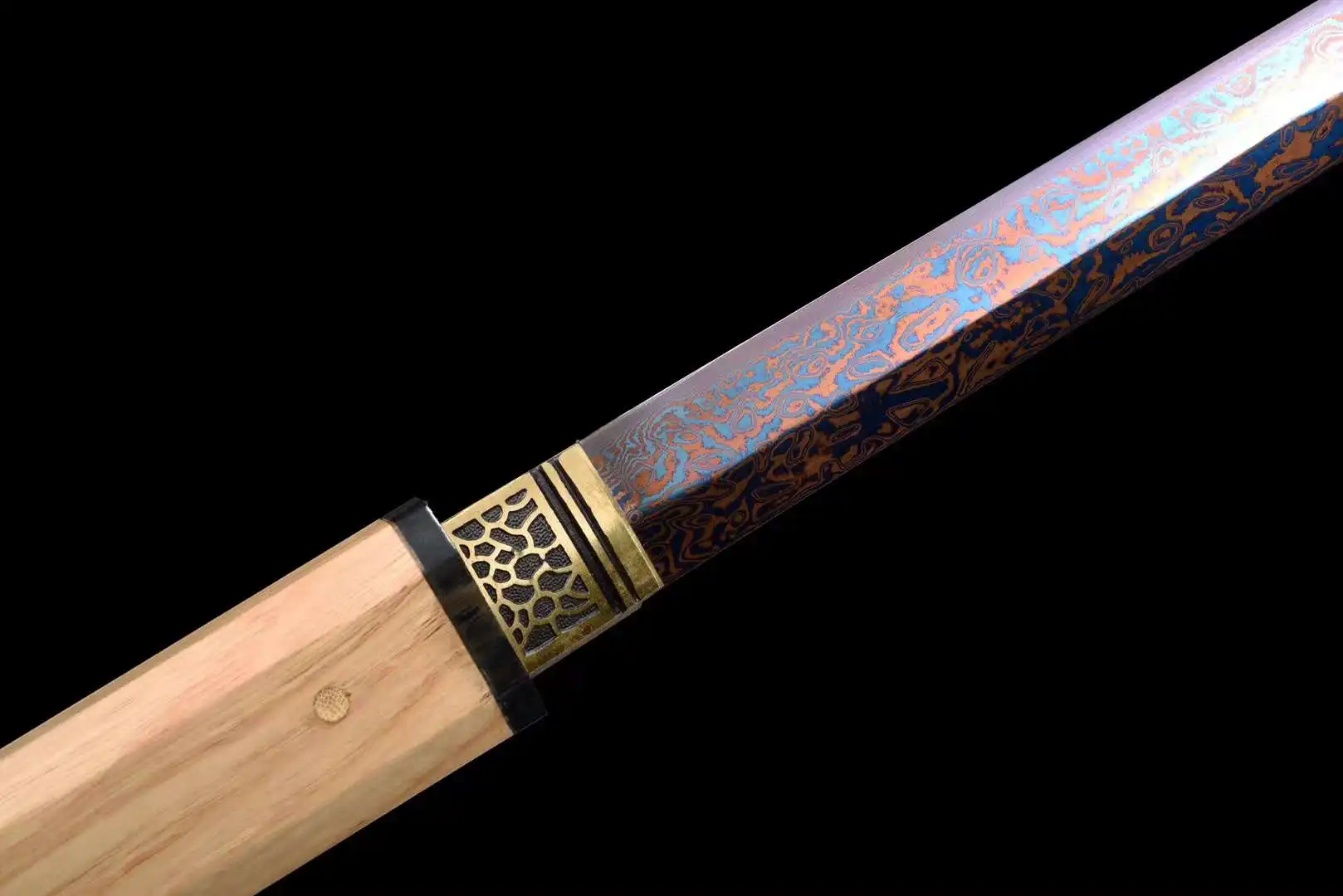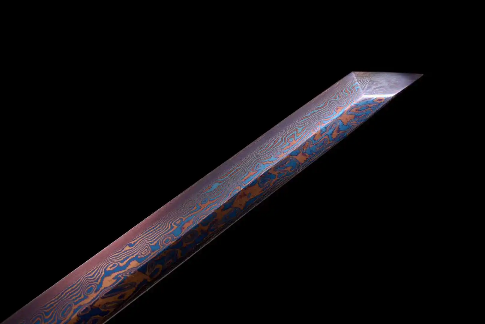 - Blade material: 608 folded Damascus steel sword blade – blue electroplated.