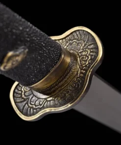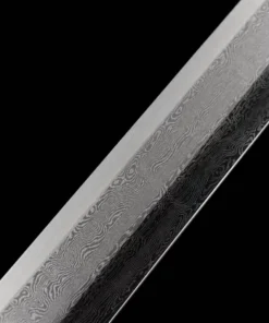 Equipped with a folded steel blade, which is a hammer-welded mixture of 1095 & 1060 high carbon steel, manganese spring steel, 1045 soft steel and many more smaller portions of other steels. This mixture is then folded multiple times to remove impurities, creating many hundreds of individual steel layers, finally producing arguably the best sword-making steel available.