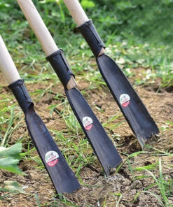 The hollow shaft collar can be fitted with any sort of handle material. Wood, steel, rigid plastics, any material can be fitted as long as it fits the handle hole. And furthermore, even without a handle, these units make a pretty good hand trowel shovel for the garden and lawn or for planting and weeding.