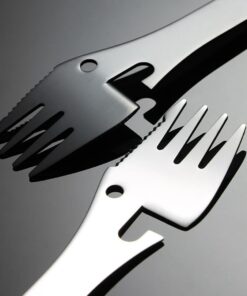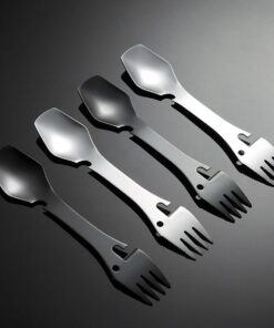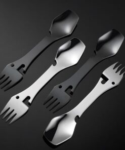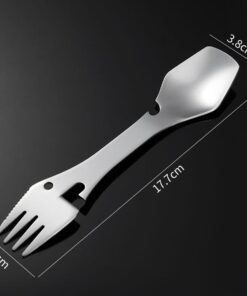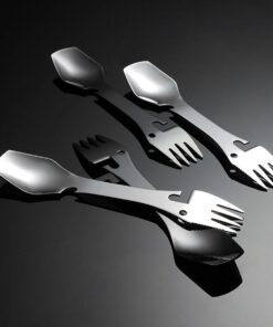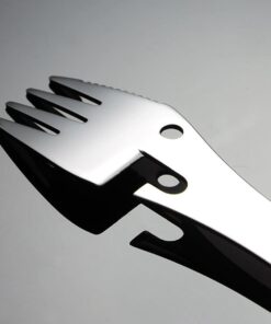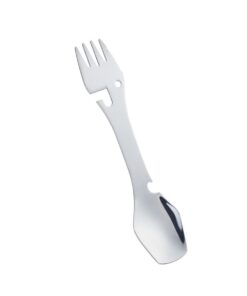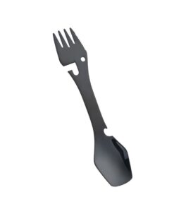 Incorporated tools: Spork, serrated knife edge, can opener, bottle opener.