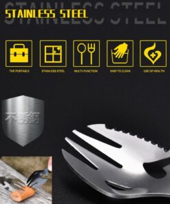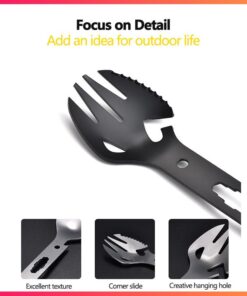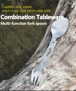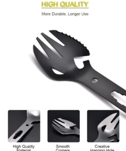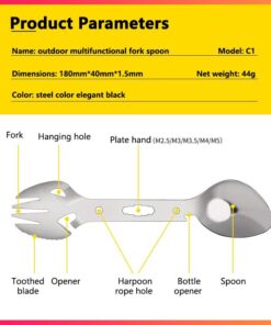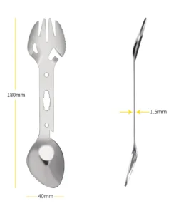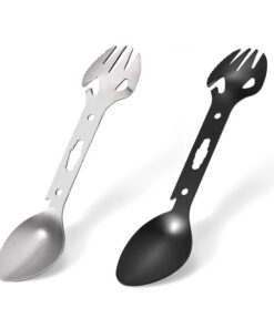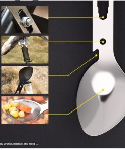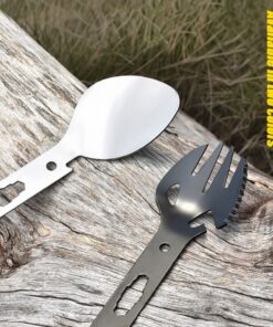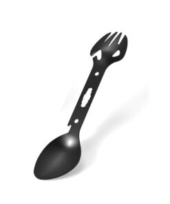 Incorporated tools: Spoon, fork, serrated knife blade, bottle opener, can opener, variable wrench.