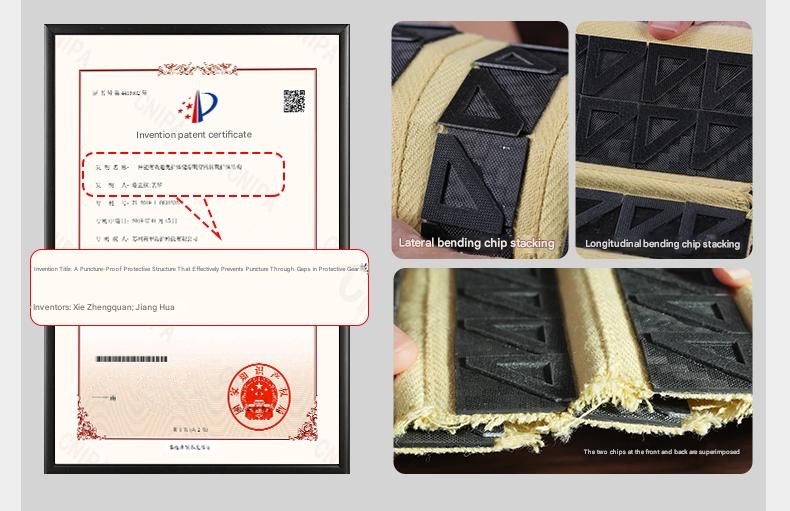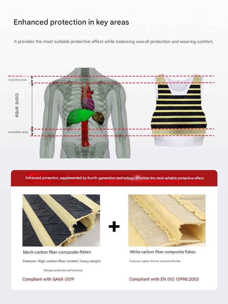 - Advanced stab proof armor materials – combined white & black carbon fibre, producing a hard, lightweight and flexible armor.