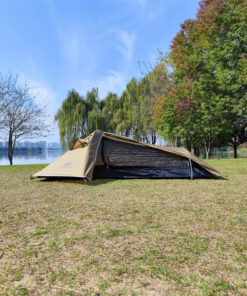What sets this solo tent apart from other coffin style army bivvy tents is the dual layer tent design, as well as the hall entry, which doubles for wet gear storage and a safe, sheltered outdoor cooking area.