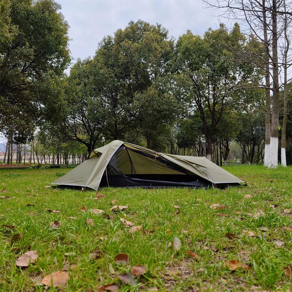 What sets this solo tent apart from other coffin style army bivvy tents is the dual layer tent design, as well as the hall entry, which doubles for wet gear storage and a safe, sheltered outdoor cooking area.