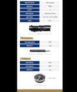 - Additional vital survival tools – Flint striker; emergency flashlight; hand held compass.