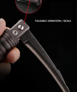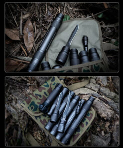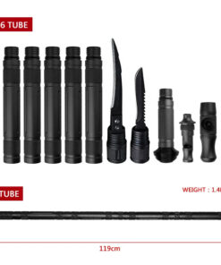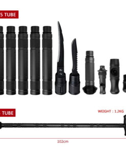 - Incorporated tools: 5x or 6x handle connection tubes; multifunction knife/saw; multipurpose serrated knife/fishing harpoon; compass attachment; glass-breaker attachment; emergency whistle; walking staff rubber tip attachment; 1x carry bag.