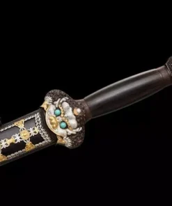 Completed with an Ebony hardwood scabbard, pure copper sword fittings – with many decorations plated in real gold & silver, and a matching Ebony hardwood handle, forming a traditional, practical and effective hand-grip.