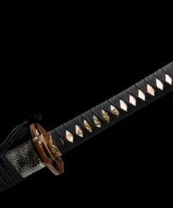 Completed with a hardwood, wrapped with stingray-skin scabbard, along with brass sword fittings – with many decorations plated in real gold & silver, and a hardwood, wrapped with genuine stingray-skin & quality cord handle, forming a traditional, practical and effective Japanese Samurai hand-grip.