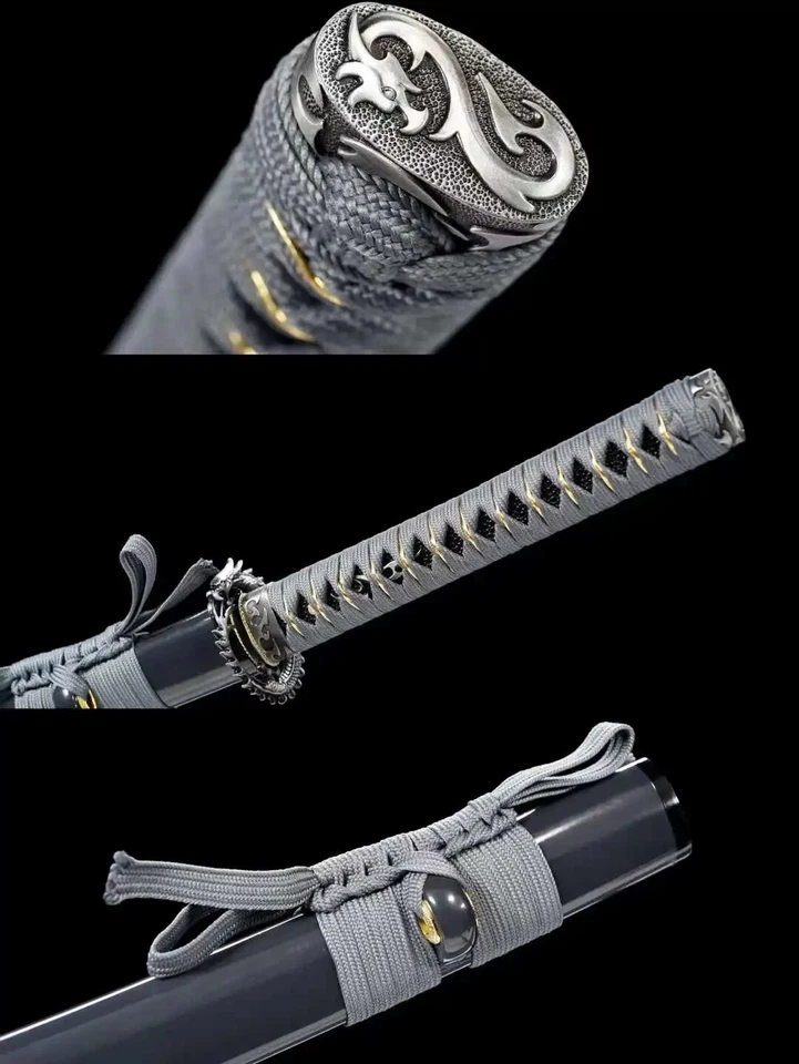 The simple, black lacquered hardwood scabbard and dragon themed brass fittings complement the grey handle color well. And the hardwood, wrapped with leather & quality cord form a traditional and very effective Japanese Samurai handle grip.