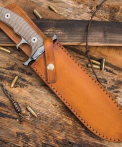 A Linen Micarta handle with an excellent gripping surface is bolted to the full tang, and a hand-guard fitted for user protection. A rear pommel acts as a deadly secondary skull cracking weapon, and the knife is housed within a genuine leather sheath which can be worn on the hip – ready for combat.