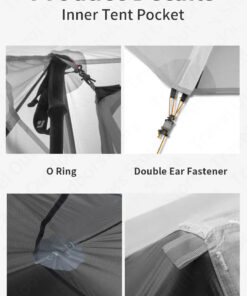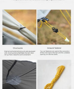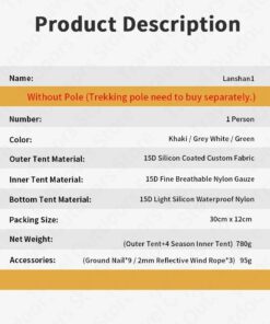 - Inner tent material: 15D silicone coated nylon bottom (PU6000mm waterproof index) + 15D nylon and mosquito mesh material.