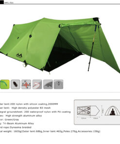 - Tent flysheet material: 20D silicone coated nylon (PU2000MM waterproof index).