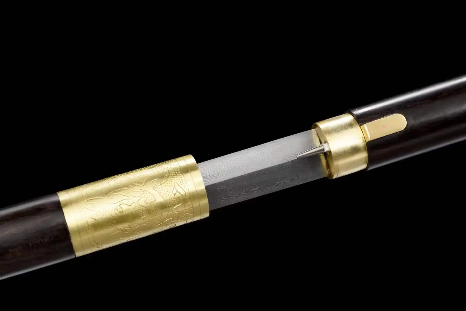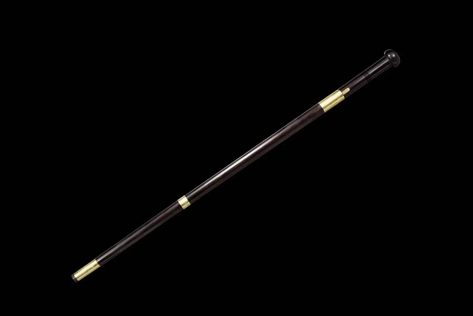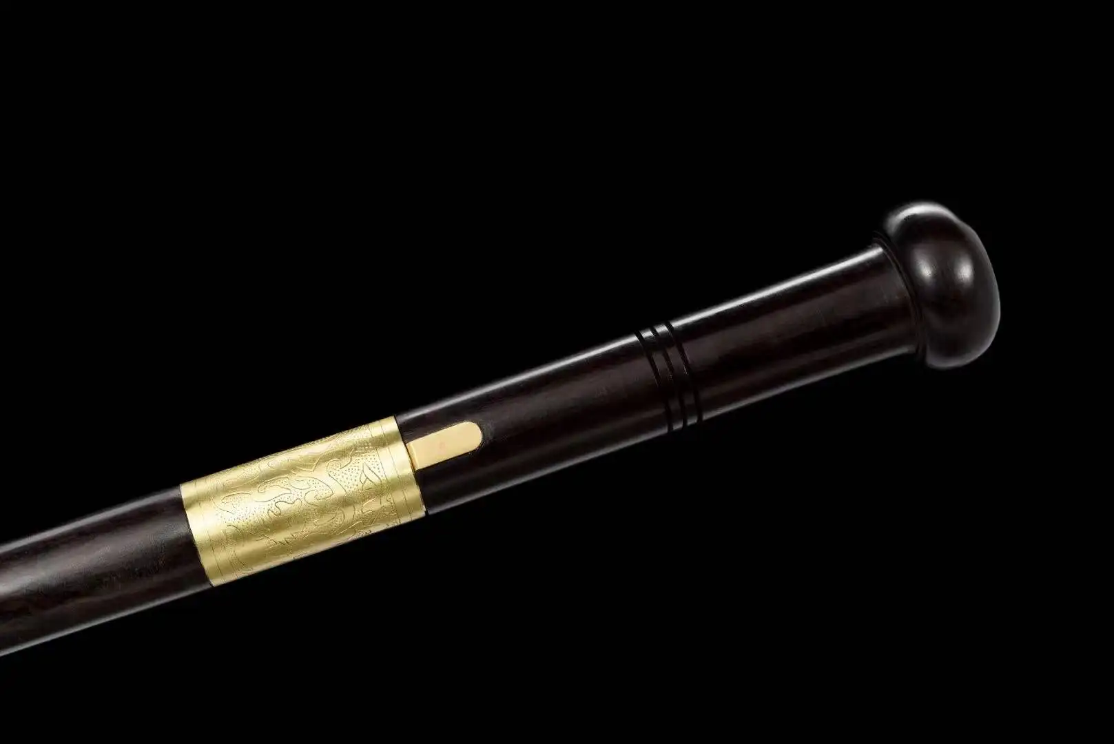The matching Ebony hardwood handle & scabbard close seamlessly together, forming a staff sword stick – locked firmly with a pin and released with a trigger. The hardwood handle acts as a simple, sturdy and maintenance free handle grip, which is not only practical to use, but also presents in a clean, classic walking-stick form.