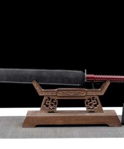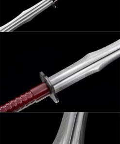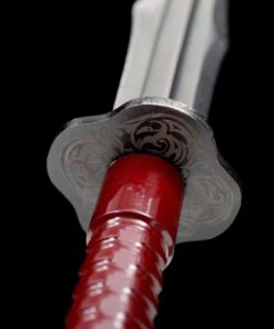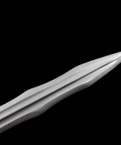 Equipped with a Damascus folded steel blade, which is a crucible mixture of 1060 high carbon steel, manganese spring steel, 1045 soft steel and many more smaller portions of other steels. This mixture is then folded multiple times to remove impurities, creating many hundreds of individual steel layers, finally producing arguably the best sword-making steel available.