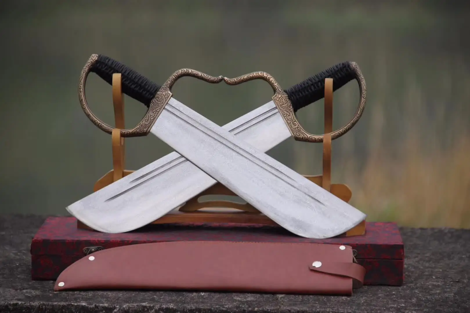 Completed with a quality-cord bound handle, solid brass hand-guard, and included with two genuine leather knife sheaths.