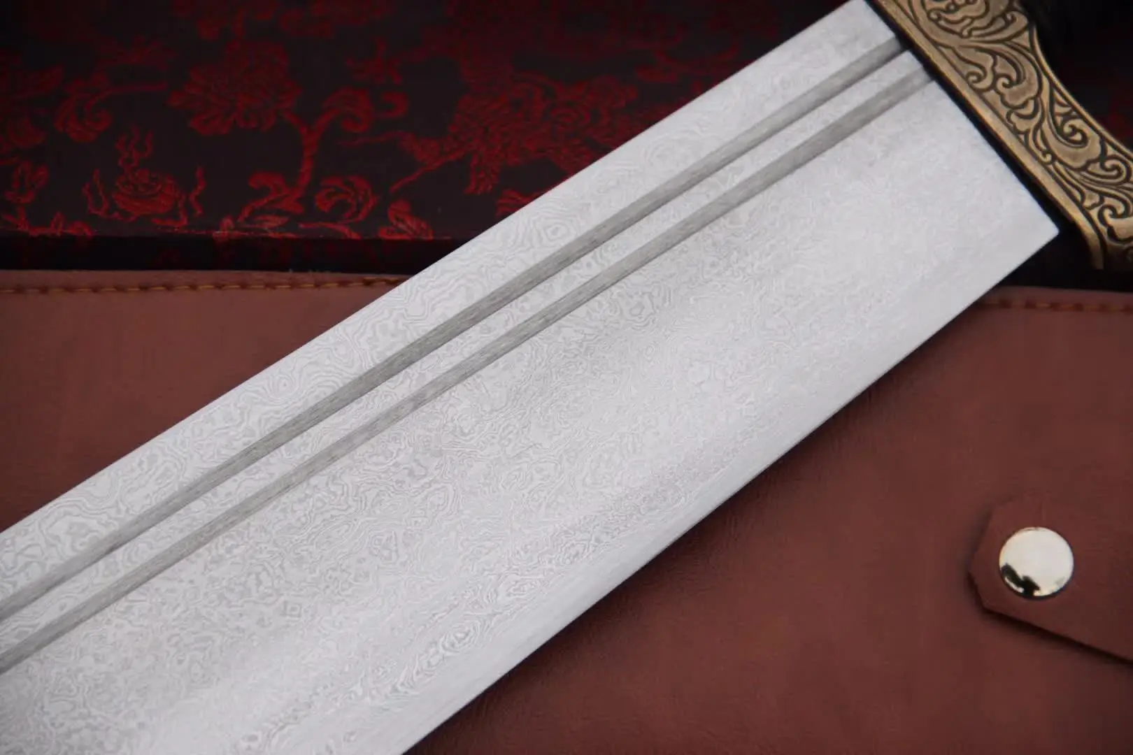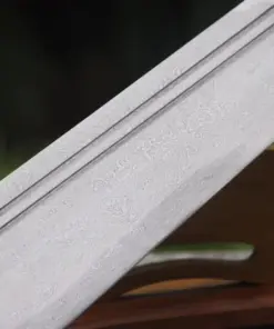 Equipped with a folded steel blade, which is a hammer-welded mixture of 1095 & 1060 high carbon steel, manganese spring steel, 1045 soft steel and many more smaller portions of other steels. This mixture is then folded multiple times to remove impurities, creating many hundreds of individual steel layers, finally producing arguably the best sword-making steel available.