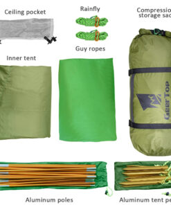 - Lightweight aluminum tent pole and tent stake material – perfect balance of strong and lightweight hardware.
